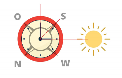 Dieser Trick funktioniert auch ohne Kompasslünette. Auch hier richtet man den Stundenzeiger an der Sonne aus und Süden ist genau zwischen 12 bzw. 1 Uhr und dem Stundenzeiger.